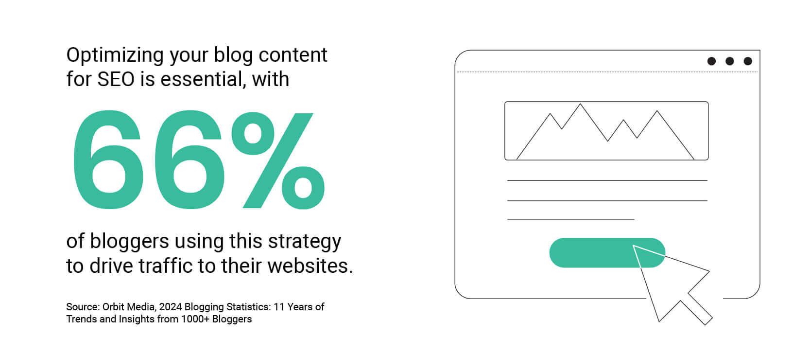 - Optimizing your blog content for SEO is essential, with 66% of bloggers using this strategy to drive traffic to their websites. (Source: Orbit Media, 2024 Blogging Statistics: 11 Years of Trends and Insights from 1000+ Bloggers)