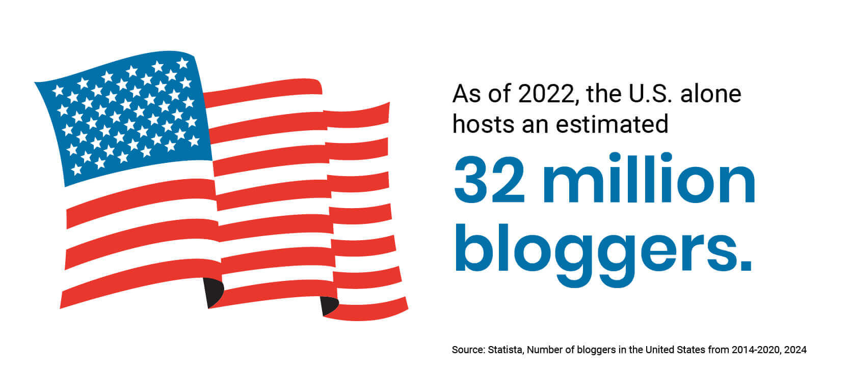 - As of 2022, the U.S. alone hosts an estimated 32 million bloggers. (Source: Statista, Number of bloggers in the United States from 2014-2020, 2024) Don’t worry, though! To clarify, you’re only competing against bloggers in your industry, not the millions mentioned in this stat.