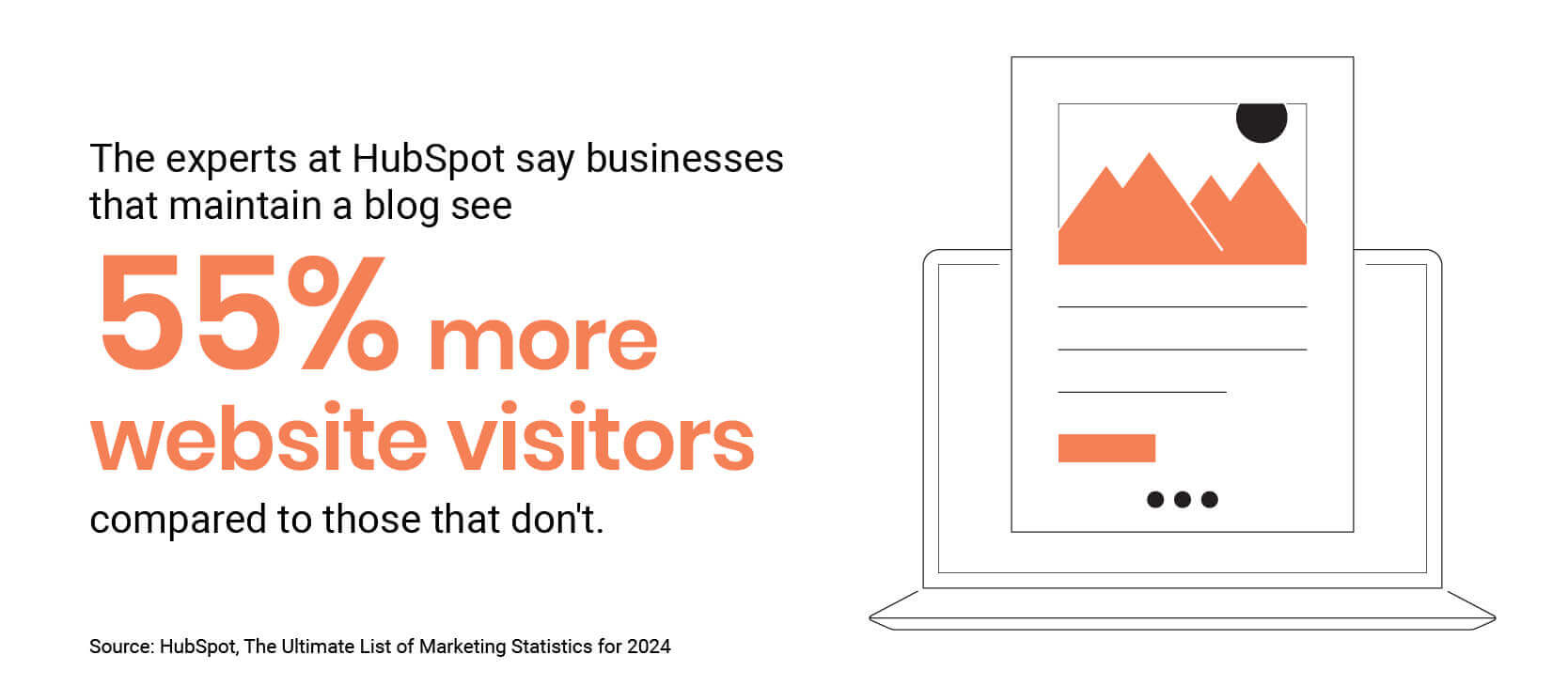 A well-executed blog can help you amplify your online presence, improve search engine optimization (SEO), and attract a wider audience by answering relevant questions and addressing customer pain points. For further support, the experts at HubSpot say businesses that maintain a blog see 55% more website visitors compared to those that don’t. (Source: HubSpot, ) The Ultimate List of Marketing Statistics for 2024