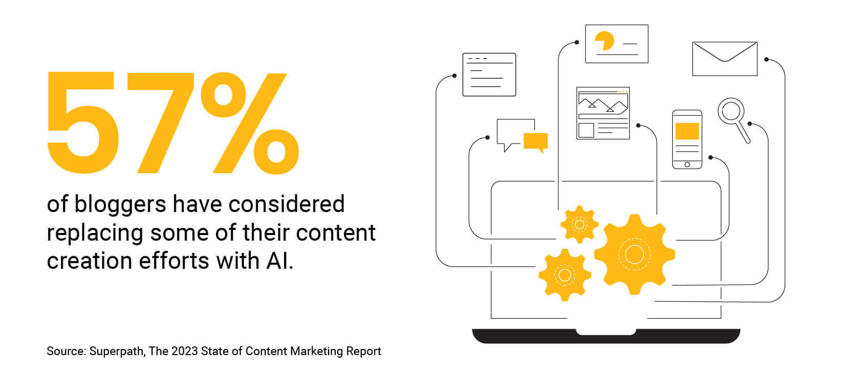 - 57% of bloggers have considered replacing some of their content creation efforts with AI. (Source: Superpath, The 2023 State of Content Marketing Report)