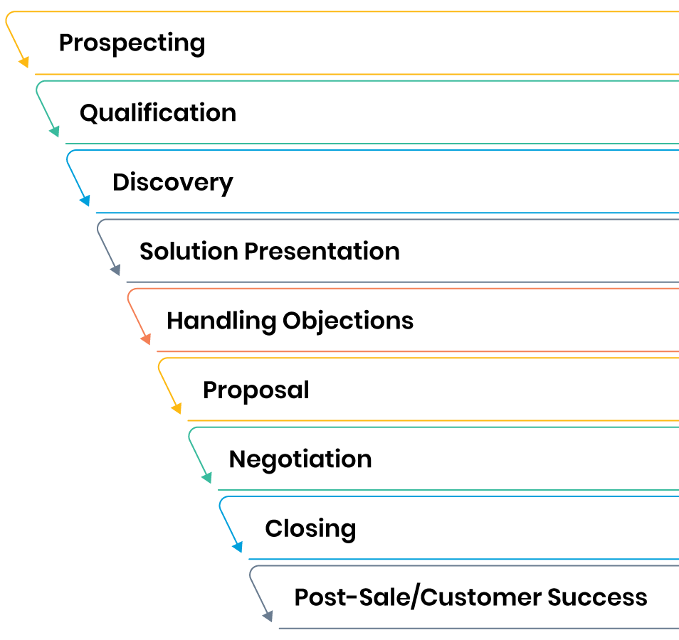 While every company adapts their process, a common structure includes: prospecting, qualification, discovery, solution presentation, objection handling, proposal and negotiation, and closing with onboarding. Some teams also include post-sale stages to support expansion and renewal. The key is aligning each stage to meaningful buyer progress, not just internal activity.