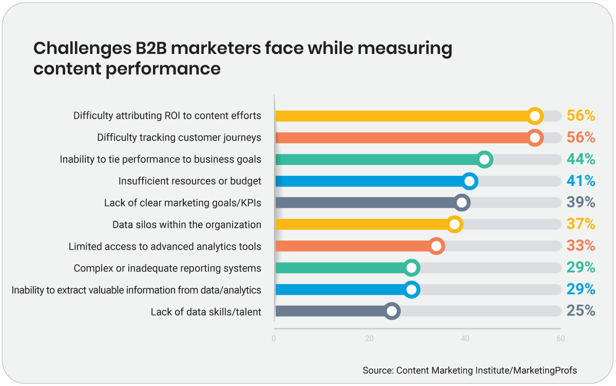 - 56% of content marketers cite attributing ROI to content efforts as a top challenge.