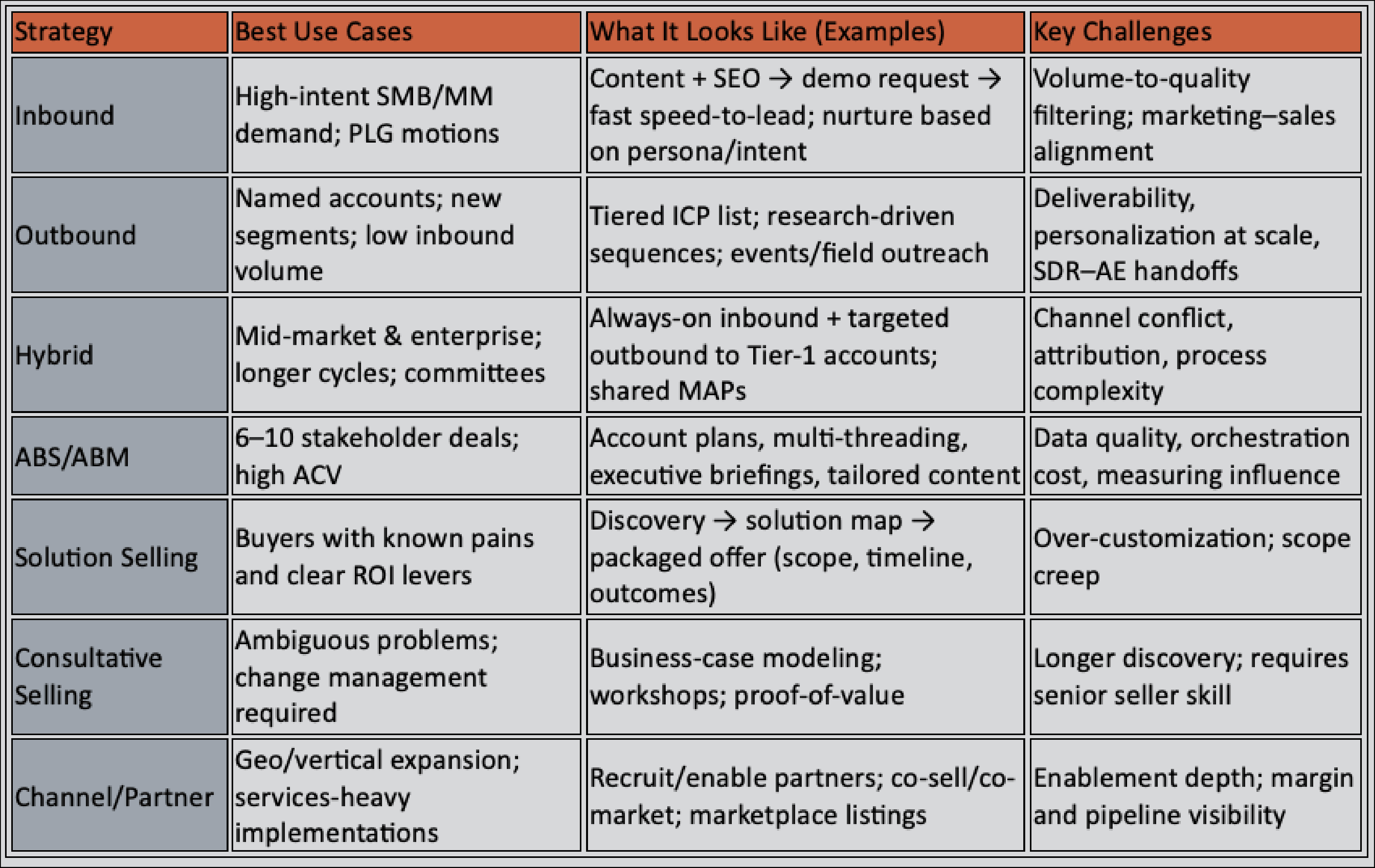 - Hybrid strategies combine the best of both worlds: continuous inbound lead generation with focused outbound efforts aimed at high-value Tier 1 accounts. This dual approach works well for mid-market and enterprise sales where multiple decision-makers are involved and buying cycles tend to be longer and more complex.