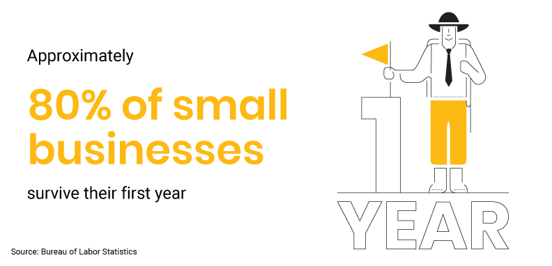 - Approximately 80% of small businesses survive their first year according to the Bureau of Labor Statistics.