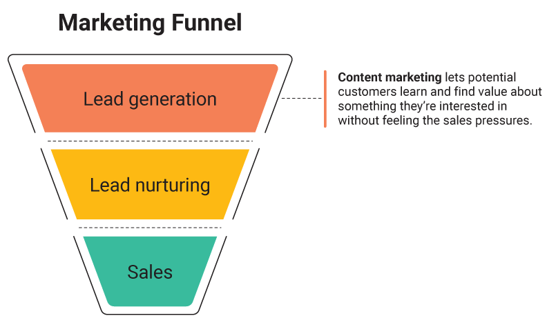 At the top of the marketing funnel, that is in the lead generation stage, content marketing shines. Informational or educational, perhaps even fun to digest, potential customers can learn and find value about something they’re interested in without feeling the sales pressures that appears further down the funnel.